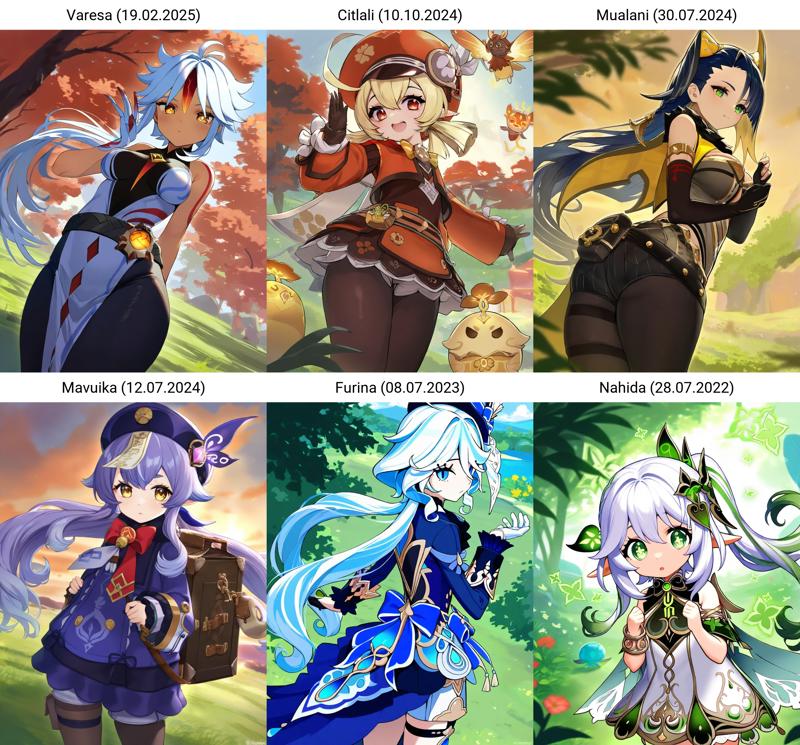 For everyone not familiar with Genshin Impact characters, here is an overview what the characters originally look like. The dates are the time when the 100th image of the character was uploaded to Danbooru, since newer models are generally able to generate characters with at least ~100 training images. All dates are in the format DD.MM.YYYY.