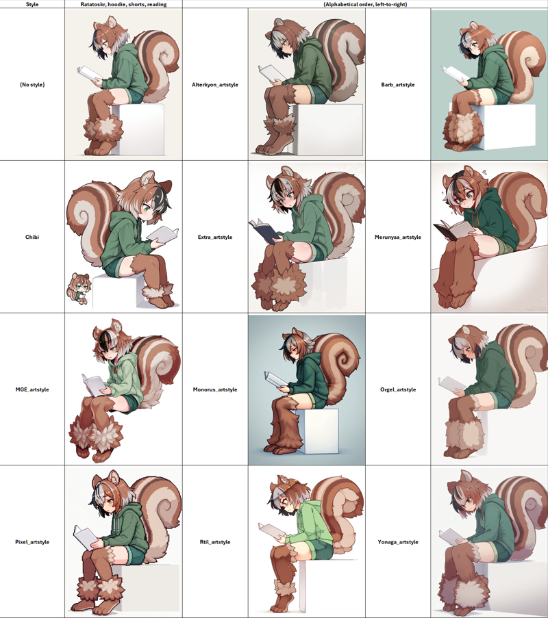 This one requires any colour tags to be removed to function properly, but with monochrome "extra_artstyle" is both quite distinct from the standard version, and is quite consistent in its differences. Monochrome works with any other style, and generally all styles should work together, but this style specifically looks different due to the fact all of MGE Vol 1’s references are greyscale, while Vol 2’s are coloured.