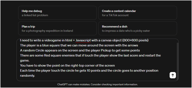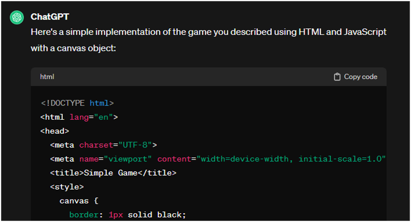 Couple of important things.. In javascript there is an object called Canvas that can be used to draw games. We will ask ChatGPT to use this object with a resolution 800x600 pixels.