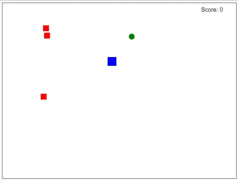 I need to write a videogame in html + Javascript with a canvas object (800x600 pixels) The player is a blue square that we can move around the screen with the arrows A Circle appears in a random place on the screen and the player Pickup to get some points. When the player touch the circle gets 10 points and the circle goes to another random place. There are 3 Red square enemies that if touch the player show the last score and restart the game. The red square move around the screen bouncing on the borders. The speed change randomly every 3 seconds. You have to show the point on the right-top corner of the screen