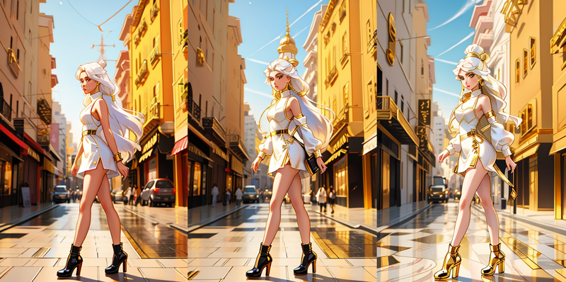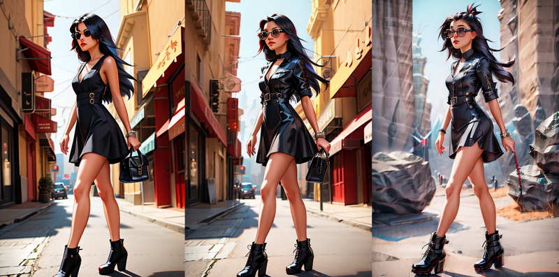 1woman walking in the street, face zoom, sexy short dress, long hair
