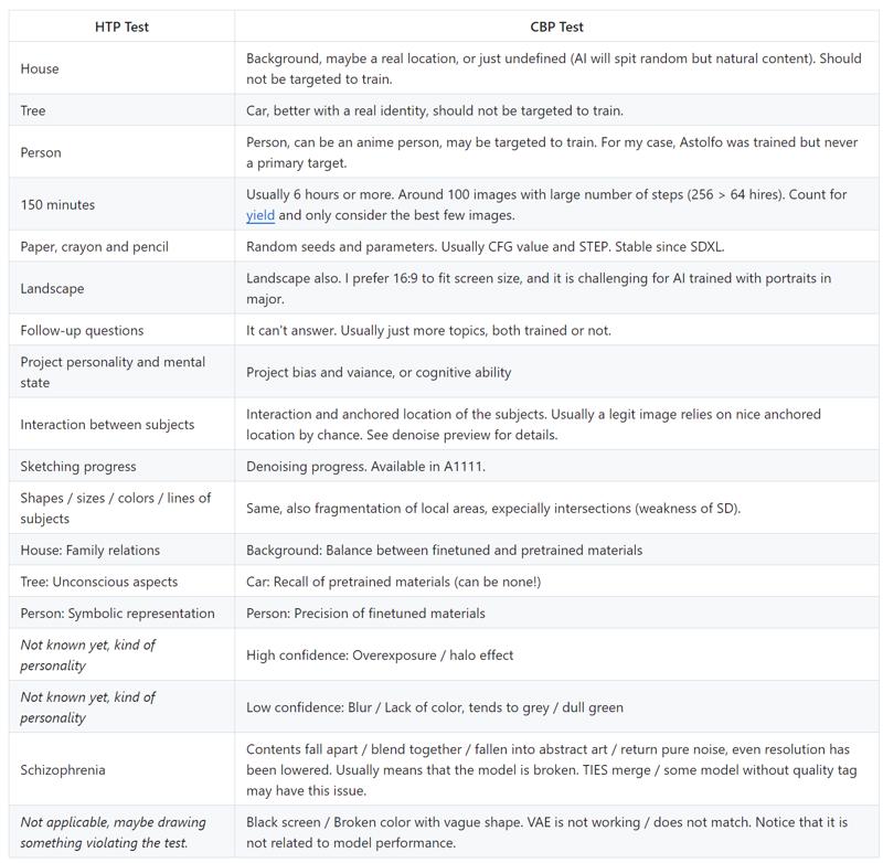 House-Tree-Person test is a popular psychology test on human, to let them project personality and subconscious mind. By either switching projection method from hand drawing into making AI model, or just let "AI model" projecting its undefined behaviour no matter how much we know it, we can design / metaphorize a qualitive test by coining the idea from HTP test. It is better then just splashing a XY grid to the academic paper with little description, then discuss on quantitative test entirely and appeal to the masses.
