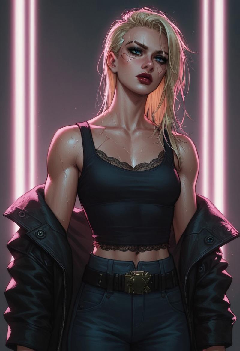 She shifted slightly, her movements fluid and controlled despite the exhaustion evident in her posture. She was muscular and yet athletic physique showcasing a perfect blend of femininity and subtle masculinity. She have a noticeable bulge in her crotch area, visible trough the snug denim of her jeans.