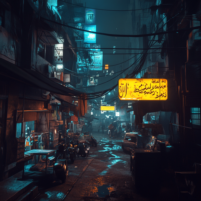 People moved with purpose here: drifters, hackers, and hustlers, slipping through alleys like shadows, knowing which corners to avoid. From underground clubs came muffled music, a heartbeat keeping the place alive. High above, corporate drones zipped past, indifferent to Amaretto's survival.