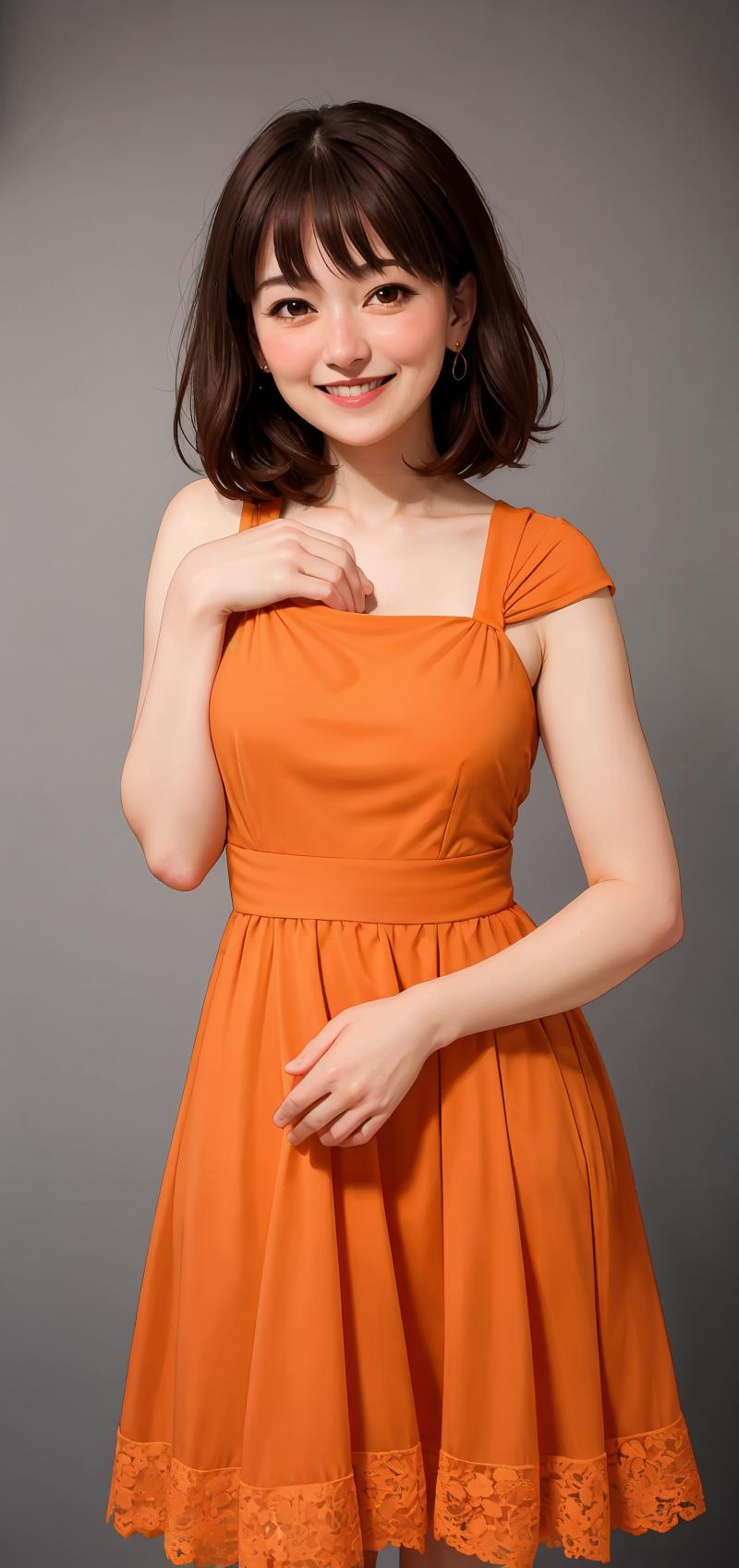 portrait, (standing:1.4), adult, caucasian_skin, smile, blush, (\blurred, dark)\-background, (\orange)\dress, (\brown)\-eyes,,