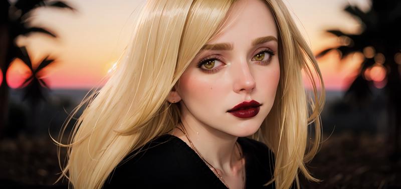 portrait, (kneeling:1.4), adult, caucasian_skin, blush, (\blurred, sunset)\-background, (\vneck, black)\sweater, (\glossy pink)\lipstick, (\blonde)\hair, (\green)\eyes, long hair, front-facing,