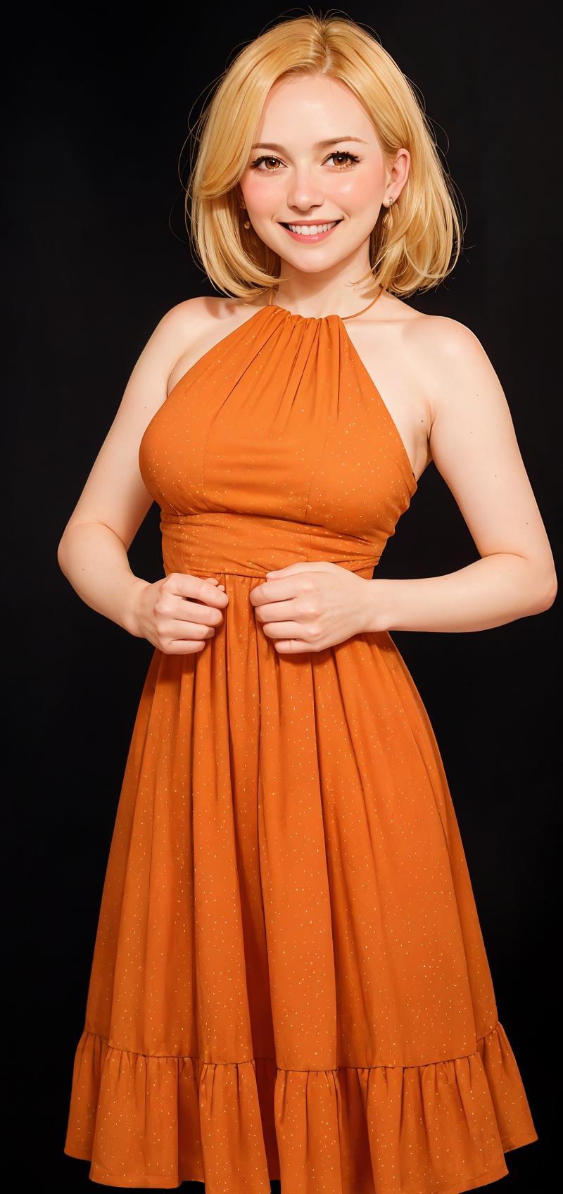 portrait, (standing:1.4), adult, caucasian_skin, smile, blush, (\blurred, dark)\-background, (\orange)\dress, (\brown)\eyes, (\blonde)\hair,,