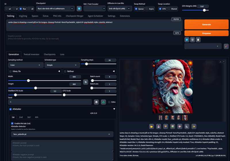 Checkpoint : Flux1-dev-bnb-nf4-V2.safetensors (https://huggingface.co/lllyasviel/flux1-dev-bnb-nf4/blob/main/flux1-dev-bnb-nf4-v2.safetensors)