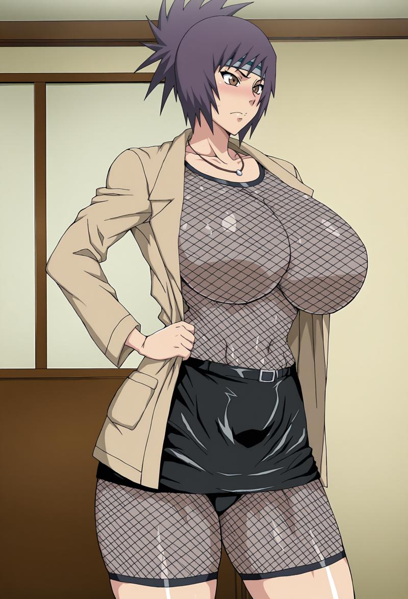 13.御手洗红豆:Mitarashi Anko,1girl,solo,black hair,brown eyes,short ponytail,spiky ponytail,mature female,huge breasts/clothes:fishnets bodysuit,open clothes,miniskirt,necklace, jewelry,skirt,