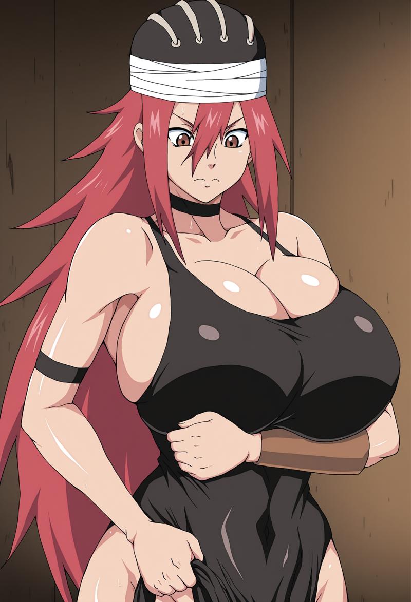 19.多由也:Tayuya,1girl,solo,brown eyes,red hair,Black hat with bandage,long hair,huge breasts