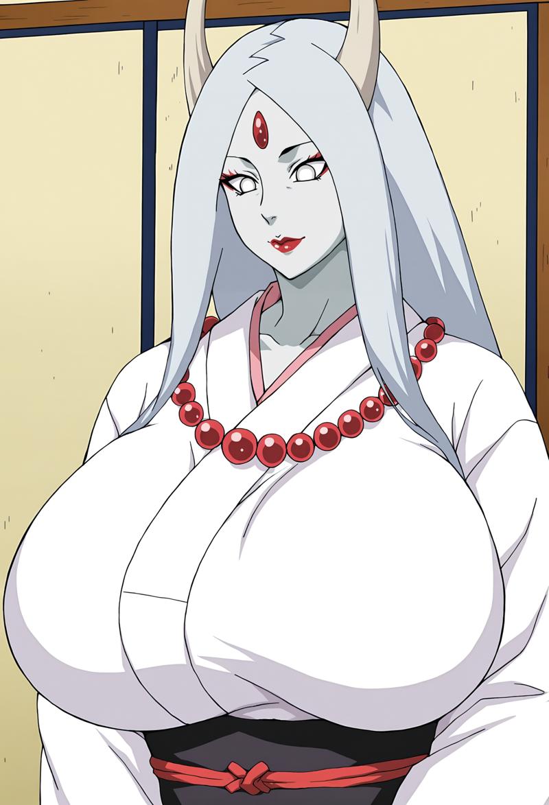 20.大筒木辉夜:Otsutsuki Kaguya,1girl,solo,horns,long hair,colored skin,forehead jewel,grey hair,forehead mark,grey skin,white eyes,make up,red lips,huge breasts,mature female,