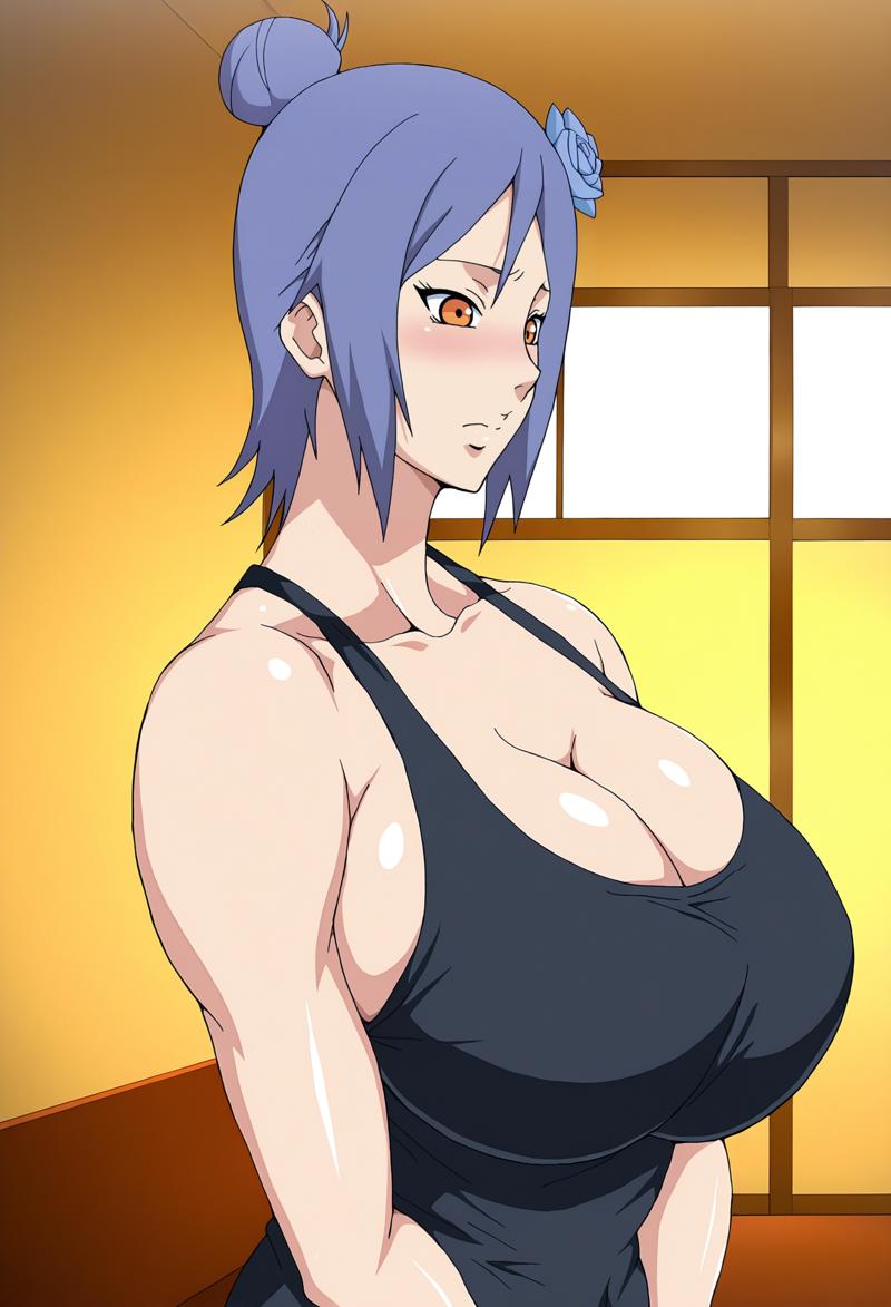 15.小南: Konan,1girl,solo, blue hair, hair bun,single hair bun,mature female,short hair,hair flower, orange eyes,huge breasts
