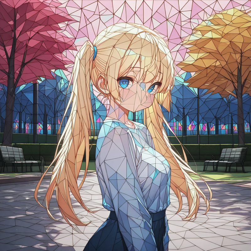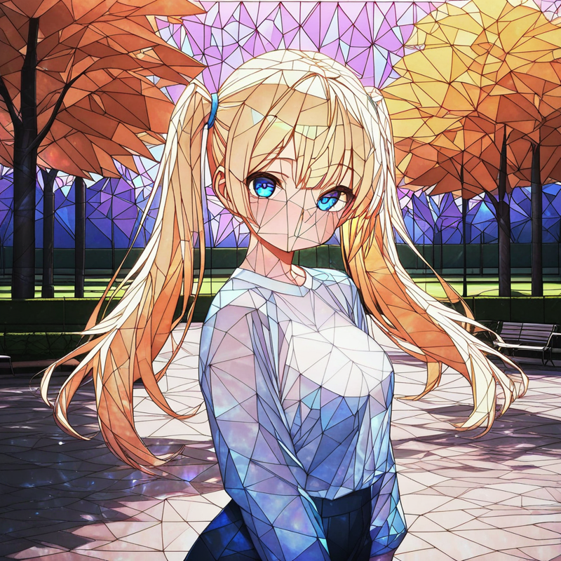 What makes glass look like glass? Reflects of course! I created a simple filter for my training set, trying to emulate the reflects I've seen in drawings of stained glass. This filter was applied to all the training set with the trigger "glass-effect". You may want to avoid very light/dark colors when using this tag, since the filter is not really appreciated in those colors (thus avoid black or white). The images below are examples generated with the tag (with the triggers "simple background", "stained-glass" and "park", respectively).