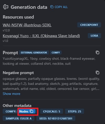 Main prompt tags: YuzoKoyanagiXL, 1boy, black-framed eyewear, collared shirt, necktie, suit <------ should always be included