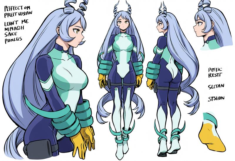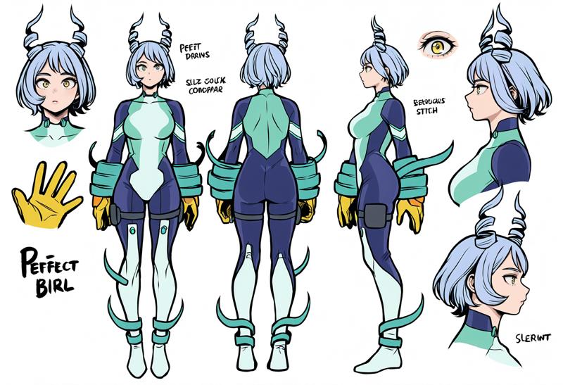 Hero Outfit (Alternative hairstyle): yellow eyes, short hair,medium breasts,bodysuit,breasts,gloves,light blue hair,superhero,boots,blue bodysuit,large breasts,yellow gloves,hair horns,green bodysuit,white footwear