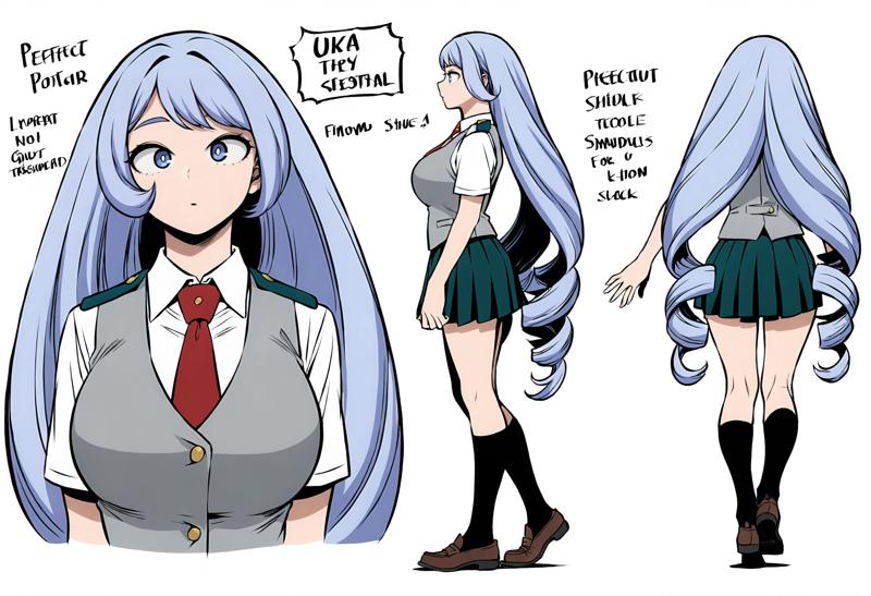 School Uniform: very long hair,u.a. school uniform,school uniform,necktie,skirt,red necktie,socks,pleated skirt,black socks,shirt,shoes,green skirt,short sleeves,white shirt,vest,breasts,kneehighs,brown footwear,collared shirt,loafers,large breasts,light blue hair,grey vest,bright pupils