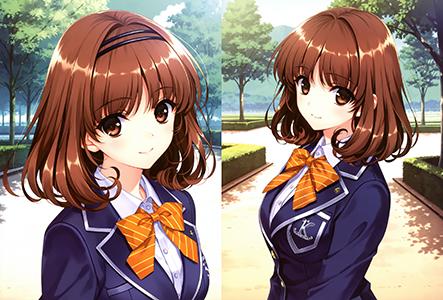 制服/校服/Uniform 服/衣服/clothing: orange bowtie, blazer, pleated skirt, 靴下/袜子/thighhighs: kneehighs, 靴/鞋子/Footwear: loafers,
