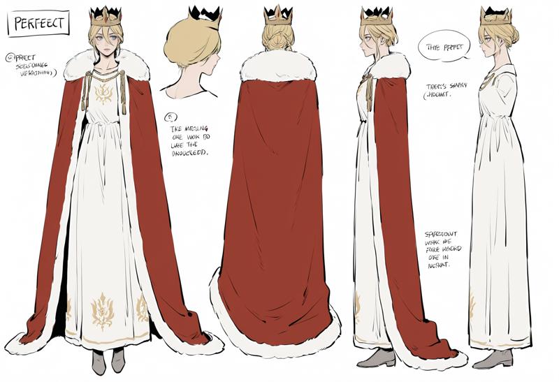 Queen Outfit: hair bun,crown,robe,cloak,cape,red cape,fur trim,fur-trimmed cape,dress,white dress,grey footwear