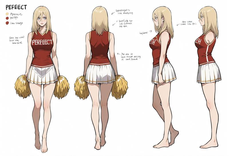 Cheerleader Outfit: skirt,pom pom (cheerleading),barefoot,pleated skirt,white skirt,shirt,red shirt,sleeveless,alternate costume,bare shoulders,breasts,sleeveless shirt,miniskirt,bare legs