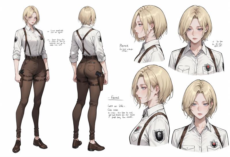 bangs,parted bangs,lips,uniform,shirt,suspenders,emblem,collared shirt,dress shirt,pocket,breast pocket,white shirt,long sleeves,sleeves rolled up,belt,buckle,pants,high-waist pants,brown pants,holster