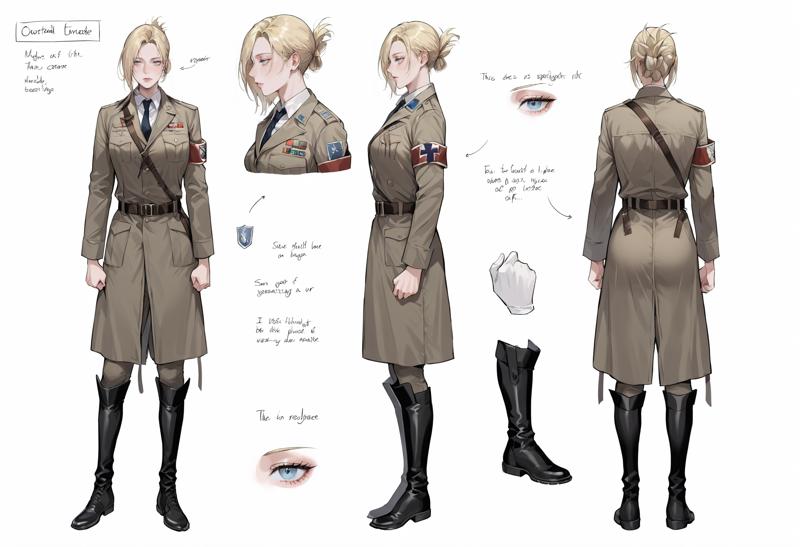 folded ponytail,necktie,uniform,military,military uniform,armband,belt,pants,boots,knee boots,alternate costume