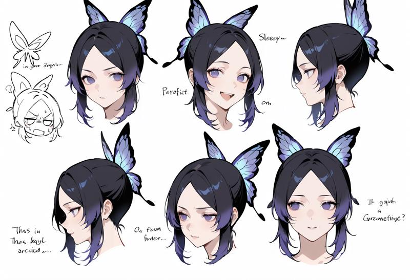 Appearance: 1girl,purple eyes,no pupils,purple hair,black hair,two-tone hair,gradient hair,short hair,multicolored hair,bangs,parted bangs,sidelocks,forehead,hair ornament,butterfly hair ornament