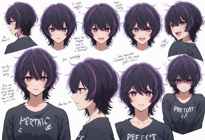 1girl,bright pupils,purple eyes,short hair,black hair,purple hair,streaked hair,multicolored hair,bangs,messy hair