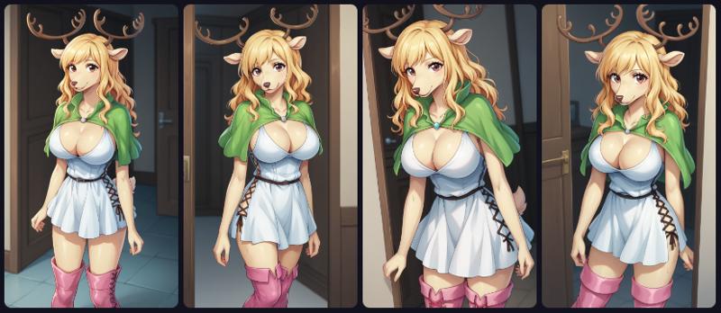 MilkyOPXLv2, anthro furry, furry female, blonde fur, brown eyes, blonde hair, long hair, bangs, deer ears, antlers, large breasts, green capelet, cleavage, white dress, black belt, pink boots