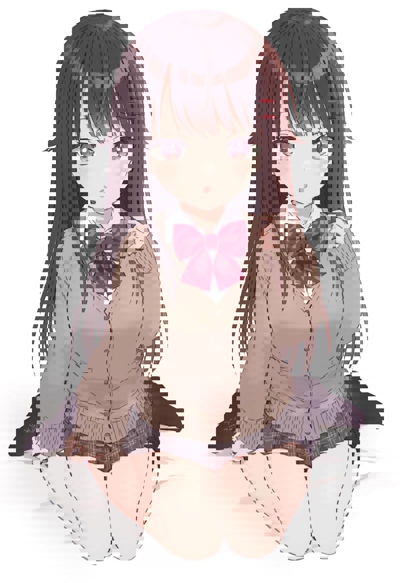 school uniform,cardigan,red bowtie,striped bowtie,white shirt,collared shirt,long sleeves,sleeves past wrists,grey skirt,pleated skirt,plaid skirt,black socks,loafers