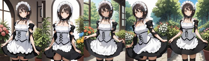 outfit1aamisaki, medium hair, brown hair, maid headdress, hairclip, brown eyes, breasts, maid, frilled choker, off shoulder, black dress, white corset, white apron, black thighhighs